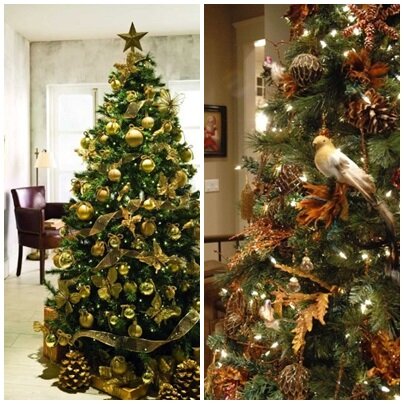 Estilo Estrella de oriente: en tu árbol abundará el tono dorado, que dará elegancia a tu salón. Decóralo con piñas, bolas, lazos y mariposas. Haz uso de diferentes tamaños sobre todo en las bolas y los lazos. Si lo deseas, puedes poner algunos detalles en tonos marrones, como bolas pequeñas.